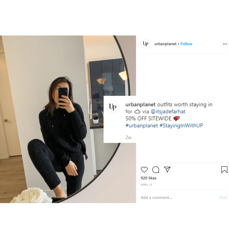 Urban Planet boosts a great example of this: they encouraged their followers to tag them and use the hashtag #stayinginwithUP for a chance to be featured on their social media feed, wearing Urban Planet clothing. See the full post here.