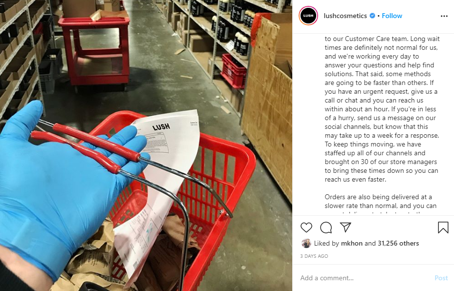 This is a great example from one of my favorite brands, LUSH, on transparency on Instagram. See the full post here.