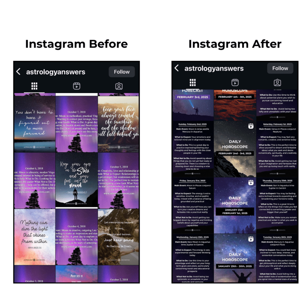 I was tasked with creating a social media strategy from scratch for a major astrology brand, as one did not currently exist. Social channels were active but lacked structure, consistency, and a clear strategic direction.